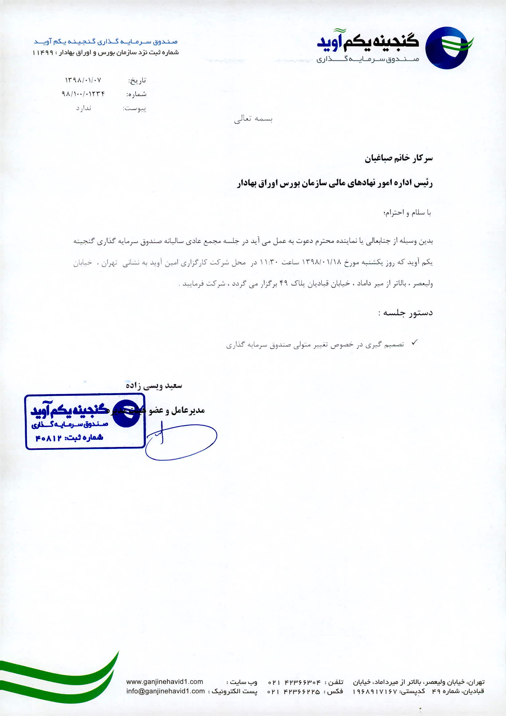 دعوت به مجمع صندوق گنجینه یکم آوید مورخ 1397/09/28ساعت 11:00